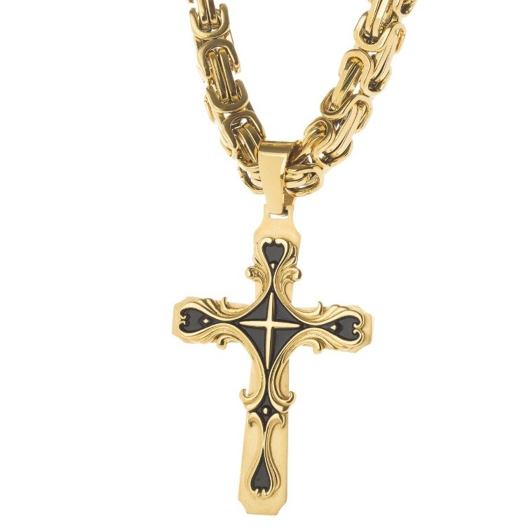Kalung salib bernuansa etnis selanjutnya yang dapat Anda pilih adalah kalung daun hitam. Aksesoris satu ini terbuat dari emas bakar dan bandulnya didesain membentuk daun ukir dengan material serupa. Kesan elegan yang terpancar dari kalung daun hitam akan melengkapi busana tradisional seperti kebaya atau tunik yang tak kalah memesona.